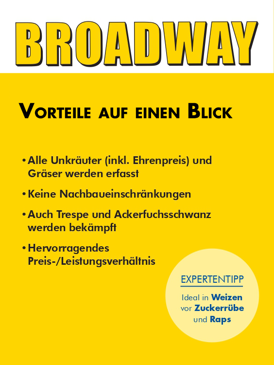 BROADWAY ist Ihr breit wirksames Herbizid gegen ein- und zweikeimblättrige Unkräuter in Winterweizen, -roggen, -triticale und Dinkel sowie Sommerhartweizen.