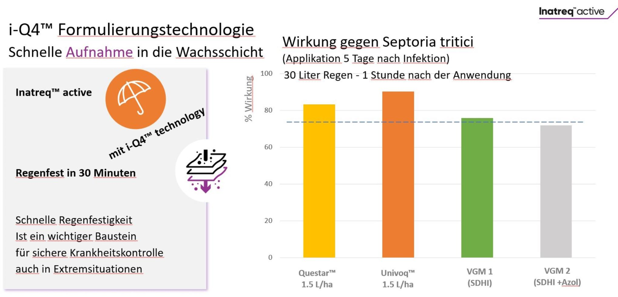 Bei hohem Krankheitsdruck und häufigen Niederschlägen sind die besonderen Eigenschaften der Fungizide Univoq und „Inatreq Aktiv Pack“ jetzt genau richtig. Ihre einzigartige Wirkungsstärke auf Septoria tritici und die rasche Regenfestigkeit in 30 Minuten durch die i-Q4 Formulierung machen sie aktuell zur besten Wahl. Zusätzlich erhalten Sie bei Teilnahme an der Aktion ein attraktives Geschenk.
