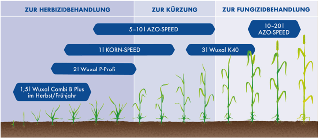 3 l Wuxal K40 gegen Trockenstress + 10 - 20 l Azo-Speed/ha zur Sicherung des Eiweißgehaltes |