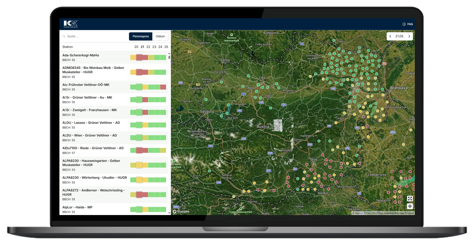 In der KX Vine App steht Ihnen ein engmaschiges Netz an virtuellen Wetter- und Prognosestationen zur Verfügung, über die der Krankheitsdruck für Oidium und Peronospora in Ihrer Region angezeigt wird.