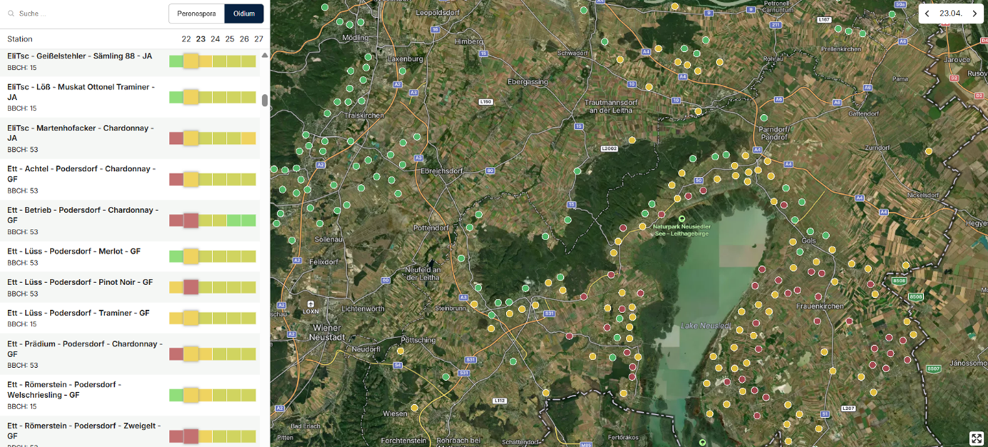 In KX Vine (https://vine.kx-digital.com) finden Sie tausende virtuelle Wetterstationen, die Ihnen neben dem Krankheitsdruck auch eine Wetterhistorie und -prognose zeigt: