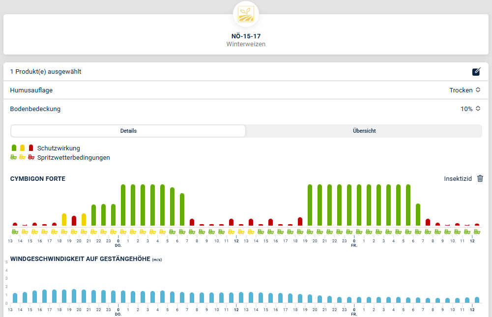 - Für Ihre Auswahl erhalten Sie eine Grafik mit den optimalen Anwendungsbedingungen in den nächsten 48 Stunden für die optimale Wirksamkeit