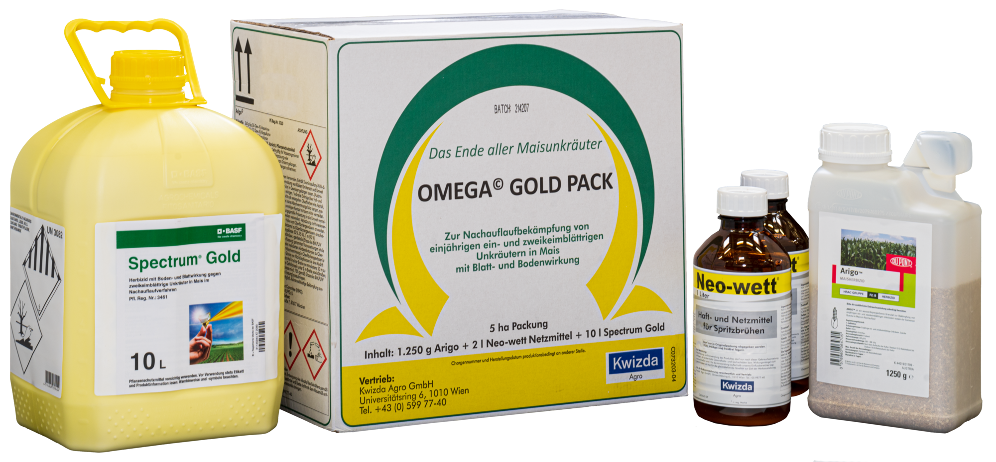 OMEGA GOLD PACK 250 g Arigo + 2 l Spectrum Gold + 0,4 l Neo-wett + 2 l Wuxal P-Profi/ha in 200 l Wasser Bei Winde und Distel: + 0,4 l Kwizda Dicamba |